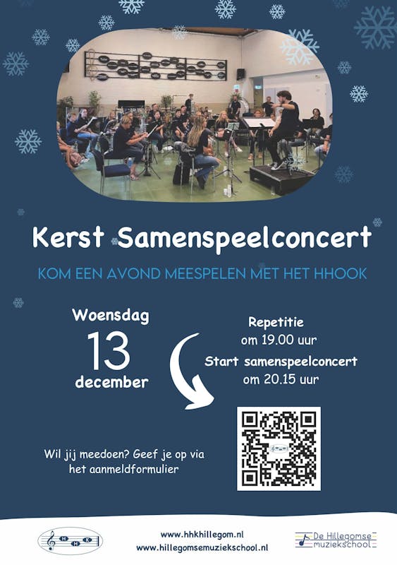 Op woensdag 13 december organiseert de Hillegomse Muziekschool samen met de Hillegomse Harmonie Kapel een Samenspeel Kerstconcert. Speel je een instrument en lijkt het je leuk om een keer mee te spelen in een echt orkest? Dit is je kans en kom mee spelen met het HHooK, het opleidingsorkest van de HHK. Onder leiding van Jeroen Bijl wordt er een uurtje samen kerstmuziek ingestudeerd om vervolgens met elkaar een concertje te geven.