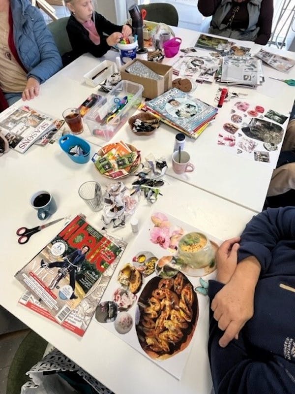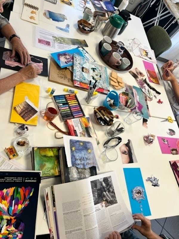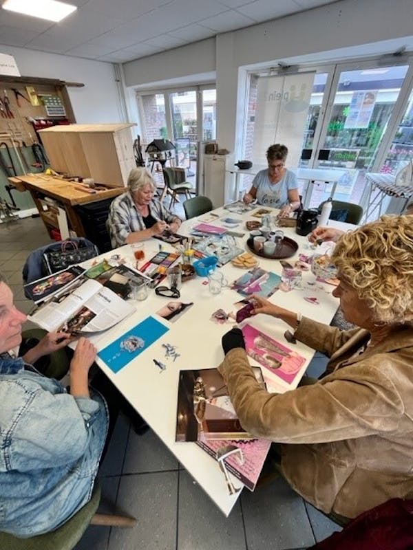 Er is een groep die wekelijks bij elkaar komt om lekker met elkaar te kletsen, maar ook aan het Art journalen zijn, je kunt namelijk gebruik maken van de materialen in Plein28.