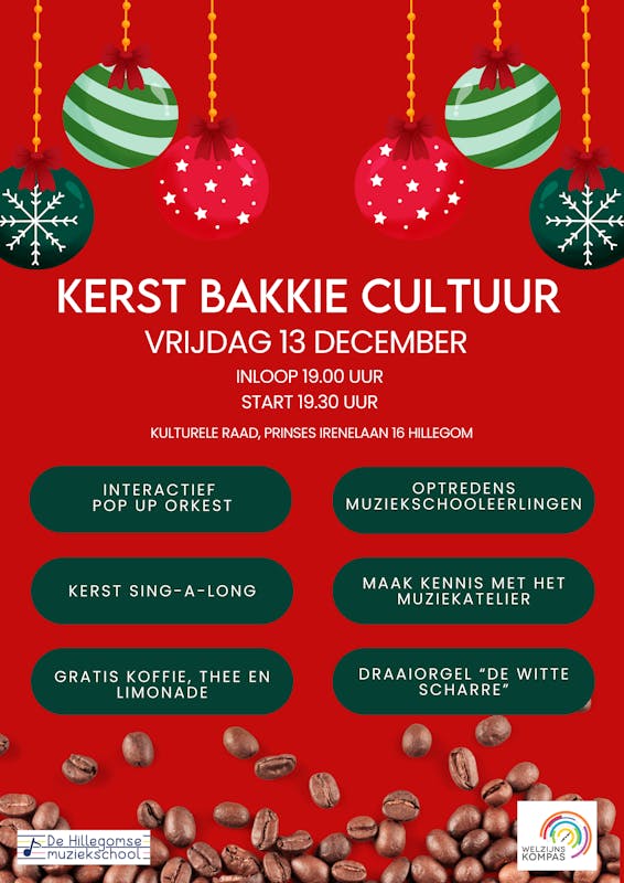 Bij binnenkomst en in de pauze is er gezellige achtergrondmuziek van draaiorgel ‘De Witte Scharre’ en als je altijd al eens zelf een nummer hebt willen draaien dan mag dat ook. Het programma begint om 19.30 met een interactief optreden van het Pop Up Orkest van de Hillegomse Muziekschool. Leerlingen van de Hillegomse Muziekschool laten je genieten van sfeervolle kerstmuziek, je maakt kennis met de makers én de band van Het Muziekatelier en we sluiten de avond af met een echte kerst sing-a-long. Een avond voor iedereen die op wat voor manier dan ook van muziek kan genieten.